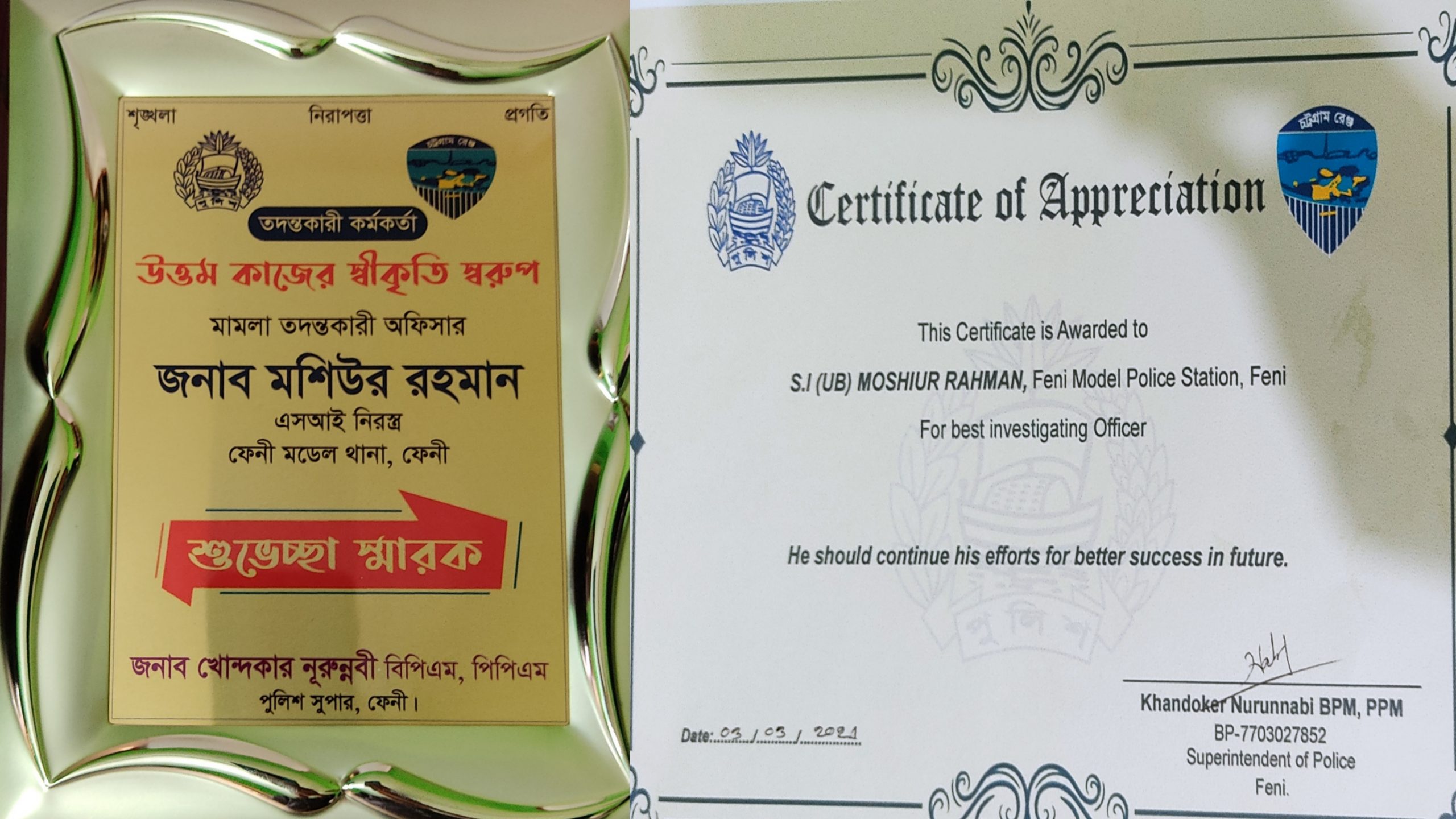 কর্মদক্ষতা ও মামলার তদন্তকারী কর্মকর্তা উত্তম কাজের স্বীকৃতি হিসেবে ফেনী শহর পুলিশ ফাঁড়ির এসআই মশিউর রহমান মনোনীত হয়েছেন ।
