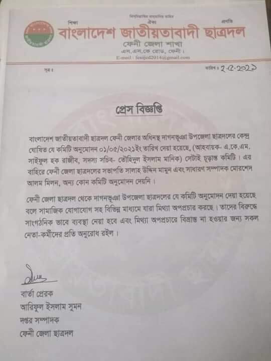তবে শনিবার নবগঠিত কমিটির তালিকা প্রকাশের পর থেকে দাগনভূঞা উপজেলা কমিটি নিয়ে সামাজিক যোগাযোগের মাধ্যম ফেসবুকে নানান অপপ্রচার শুরু হয়েছে।