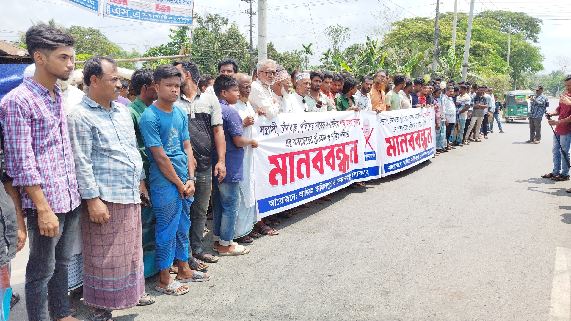 ফেনীর দাগনভূঞা উপজেলার অবসরপ্রাপ্ত  পুলিশ সদস্যের শাহ আলম দুলালের  চাঁদাবাজি ও অত্যাচারের বিরুদ্ধে মানববন্ধন করেছে এলাকাবাসী।