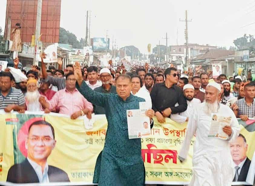 জনতার ঢল যেন এই বার্তার সাক্ষী হয়ে দাঁড়িয়েছে তারাকান্দার এই জনস্রোত যেন প্রত্যয় বহন করছে,ধানের শীষের পতাকা উড়িয়ে।